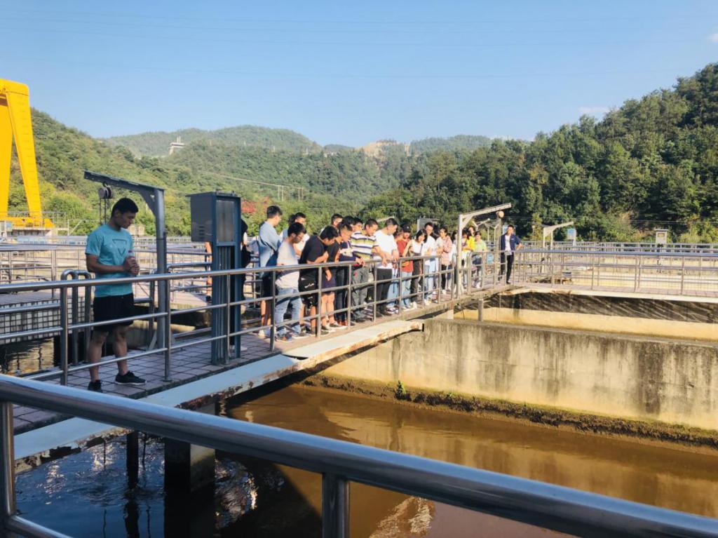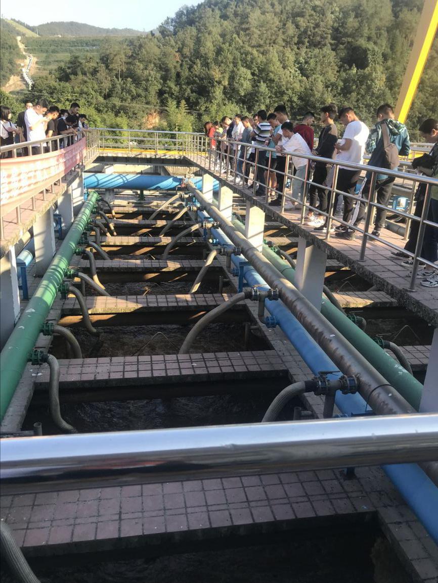 下午天气格外炎热,我们怀着激动的心情在14:00就从公司出发前往十堰市(神定河)污水处理厂,在炎炎烈日之下,我们用3个多小时的时间依次参观了神定河污水处理一期、二期工程,其中一期工程的处理工艺流程为“粗格栅→污水提升泵房→内进式格栅→沉砂池→A/O池→辐流式二沉池→消毒池→出水”;二期工程的处理工艺流程为“粗格栅→污水提升泵房→内进式格栅→沉砂池→A/A/O池→MBR池→消毒池→出水”。在老师们对污水处理单元及其运行工艺的详细讲解下,同学们对污水处理有了初步认识,而且就员工提出的关于污水的来源及成分、处理方法及成效、处理后污水的去向及用途等问题,一一进行了详细解答。整个参观过程中,大家都细心听取,认真记录并不时提出各种问题。