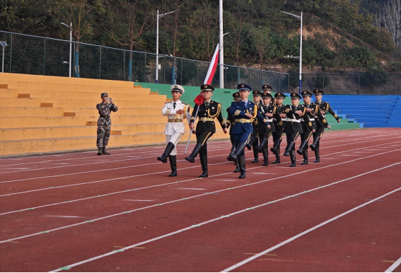 早上7:00,在全体师生的注目下,英姿飒爽的国旗护卫队护送鲜艳的五星红旗进场。伴随着庄严的《义勇军进行曲》,五星红旗冉冉升起,迎风飘扬。全体师生庄严肃立,面向国旗行注目礼。