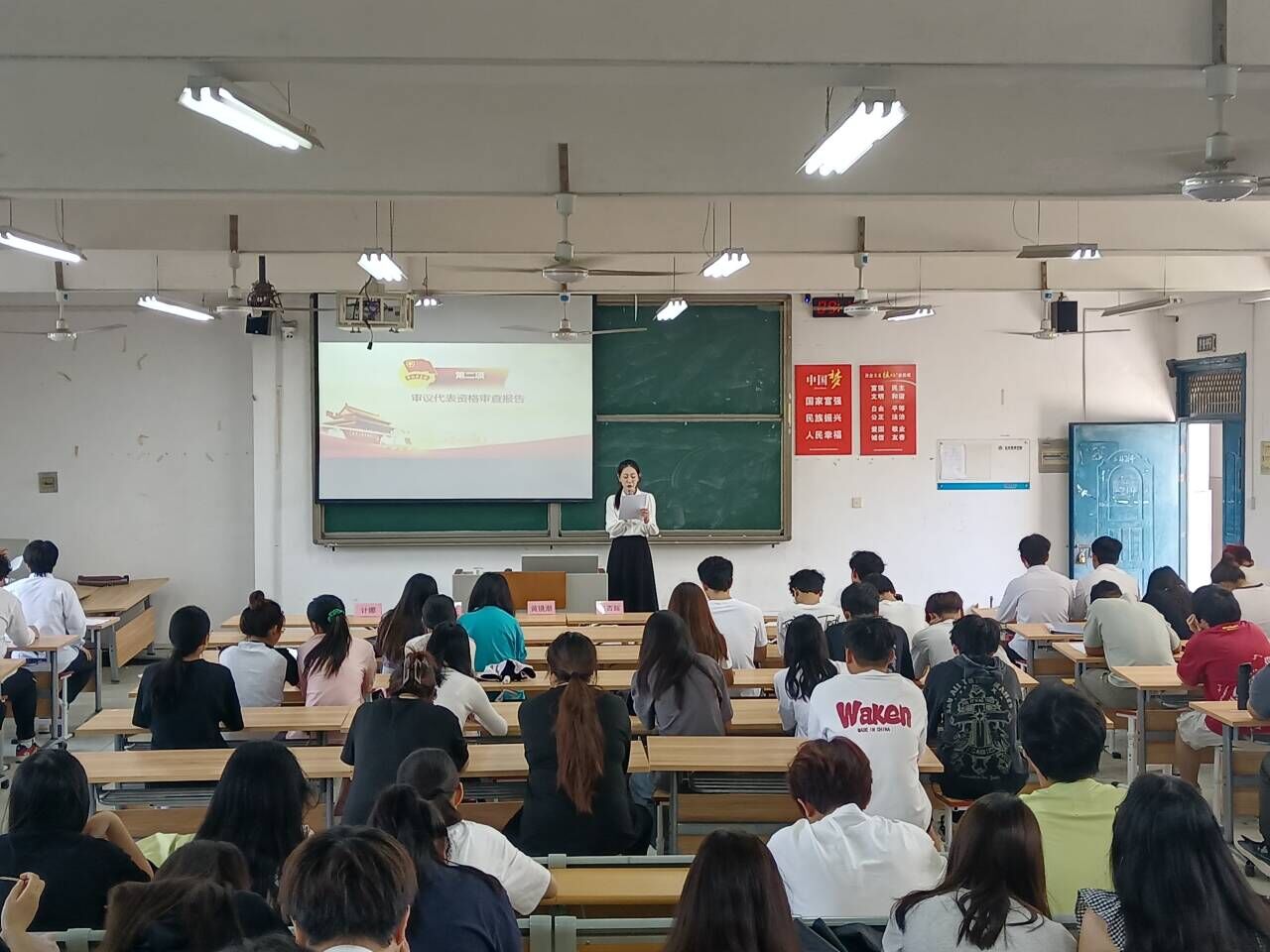随后,22名竞选者逐一上台竞职演讲,他们结合自身对岗位的认识、竞选的优势和未来对工作的展望,阐述自己的竞选目标。22位候选人的精彩演讲和出色表现赢得了在场师生的热烈掌声。最后王丹公开票数,由明瑞光副书记、张杏辉老师以及卢珊珊老师为干部当选者颁发荣誉证书。同时明瑞光书记做总结发言,他感谢了同学们的努力与辛苦付出,也肯定了干部的认真负责和积极工作的态度,更对新一届的员工会干部提出要求以及展望。