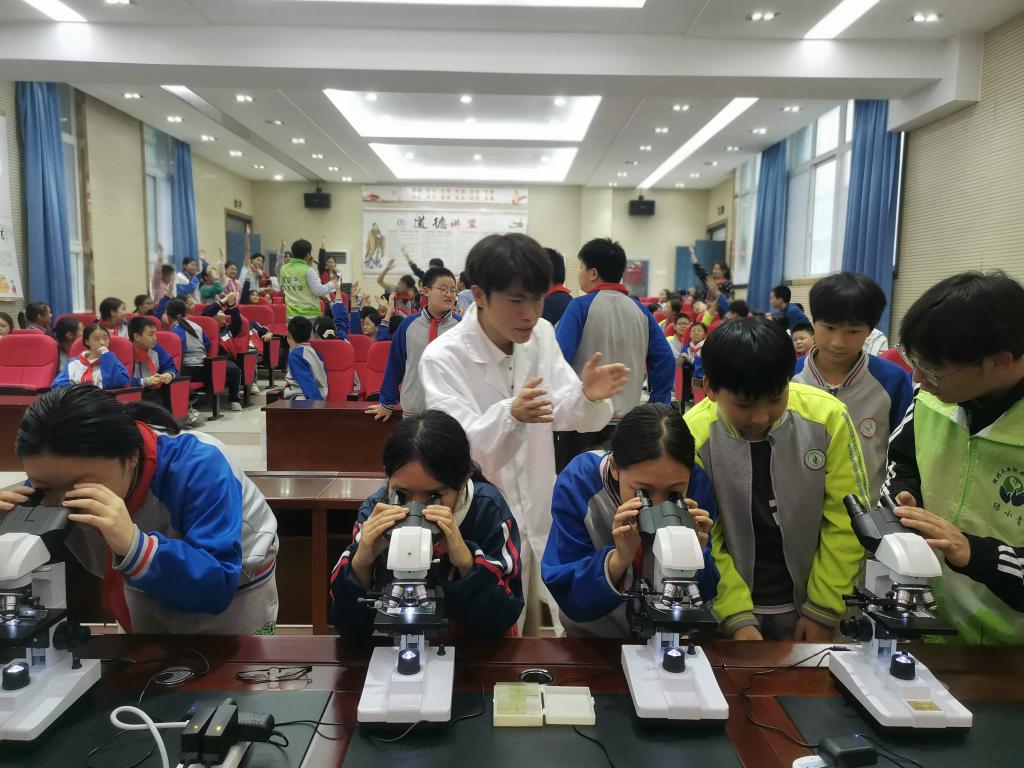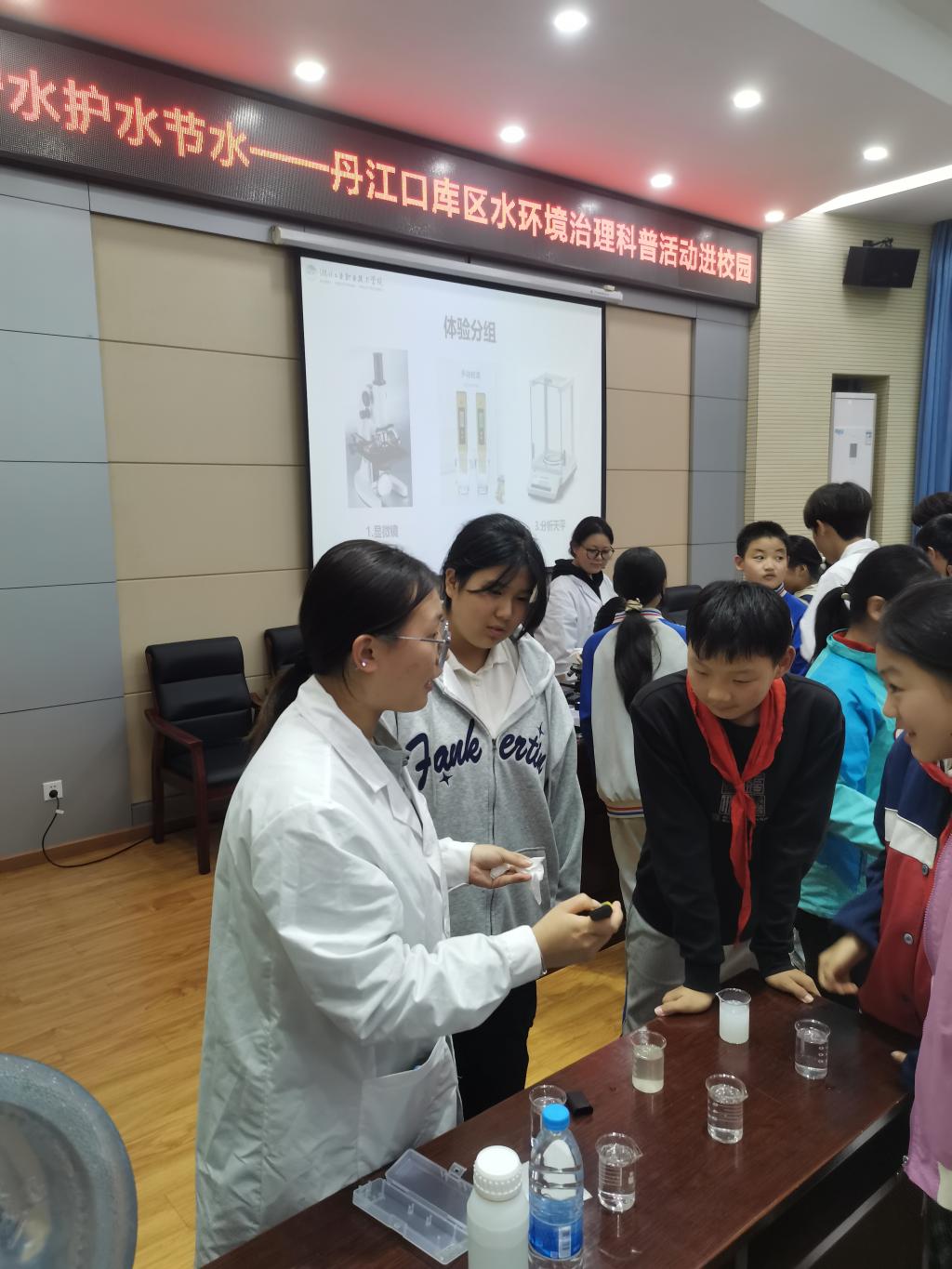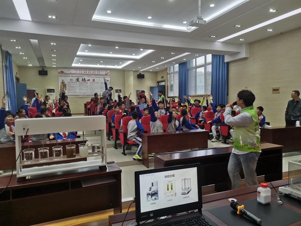 水质检测环节,在介绍水质检测小仪器的基本原理和操作步骤后,同学们分批踊跃上前进行了体验。绿小青队长杨方铭指导同学们使用显微镜,观察水中的微生物以及各种动植物切片;科普分队队长陈洁指导使用便携式PH计,测量了牛奶、泥沙水、酸性白醋的PH含量;赵缘指导使用分析天平,用固定称量法、变量称量法对氯化钠的重量进行了称量;余嘉豪和孙源洁、肖鑫均还分别向同学们展示了六联搅拌机净化水质、超声波清洗仪清洗眼镜污垢的过程。