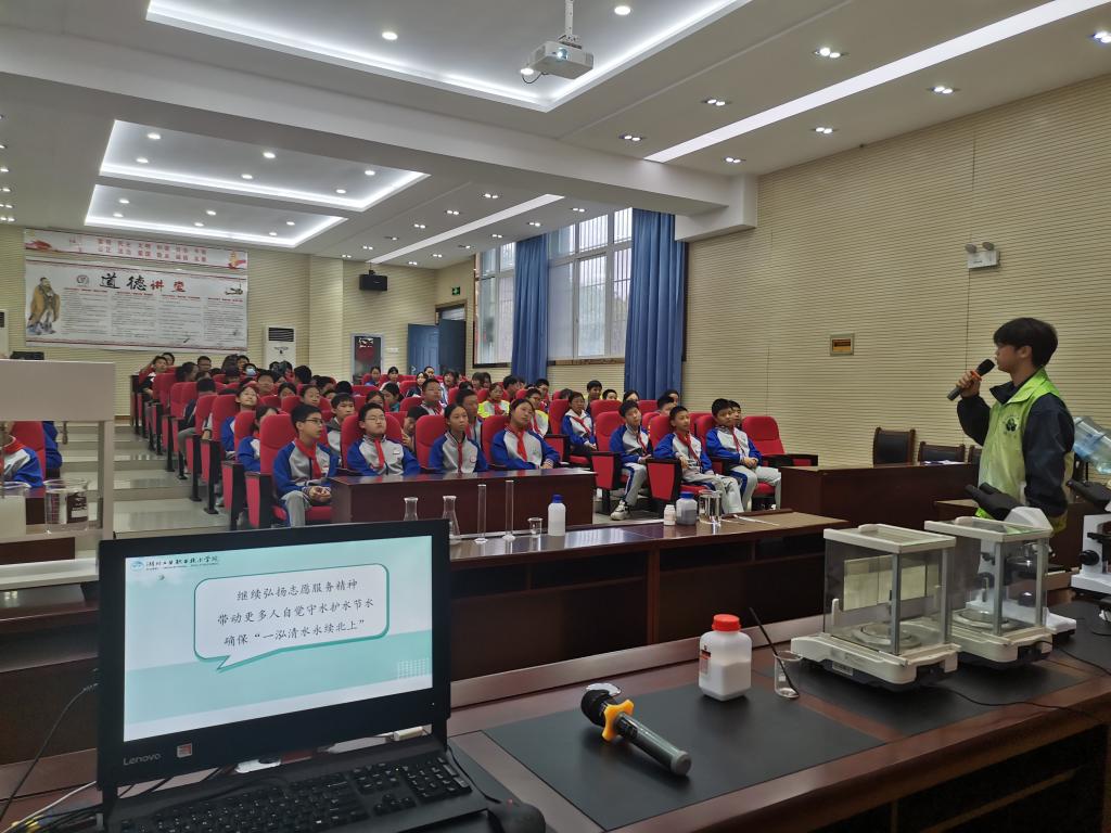 绿小青环保志愿服务队指导教师杨洋向同学们介绍了绿小青环保志愿服务队践行习近平总书记回信精神,发挥专业优势深入机关、公司、社区和乡村开展守水护水节水志愿服务活动的情况,激发了同学们对水环境治理知识的浓厚兴趣。