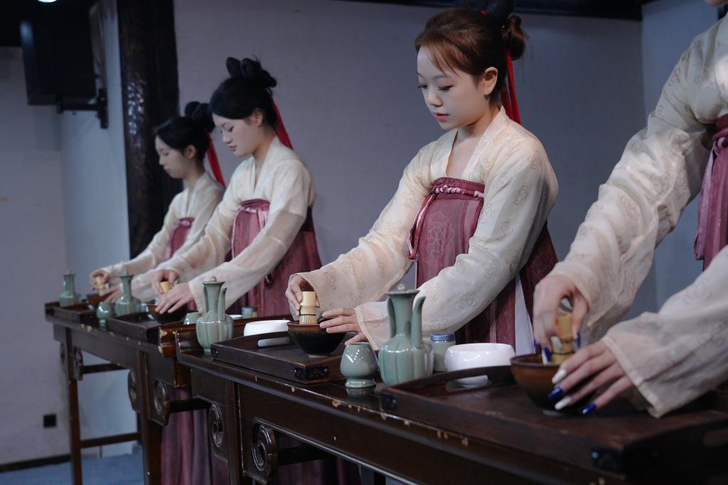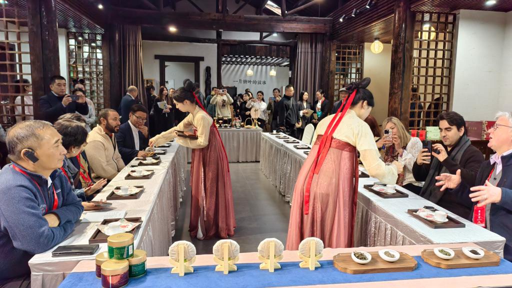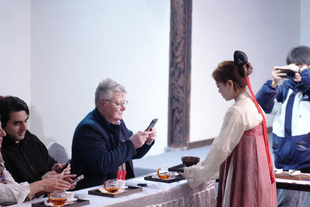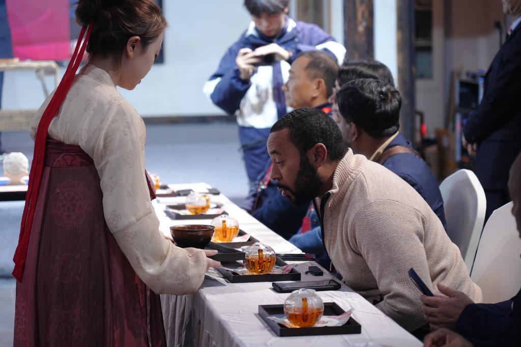 茶席之上,员工以清水为墨,以茶匙为笔,以沫饽为纸,现场绘制太极图样,举手投足皆成风景,吸引大使频频拍照。行云流水般的长嘴壶表演与庄重典雅的武当道茶礼,更让嘉宾沉浸式领略了“茶、道、武”相融共生的中华韵味。